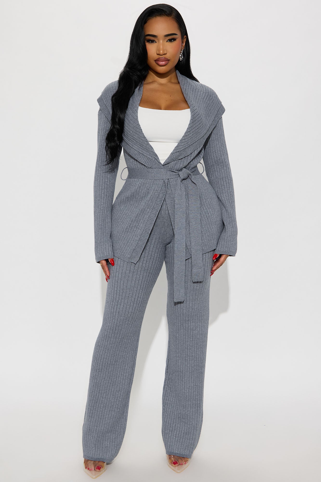 Available In Charcoal And Cream. 2 Piece Ensemble Off Shoulder Cardigan And Straight Leg Pant Set Stretch 32.5" Inseam Elastic Waistband 50% Viscose 28% Polyester 22% Nylon Imported