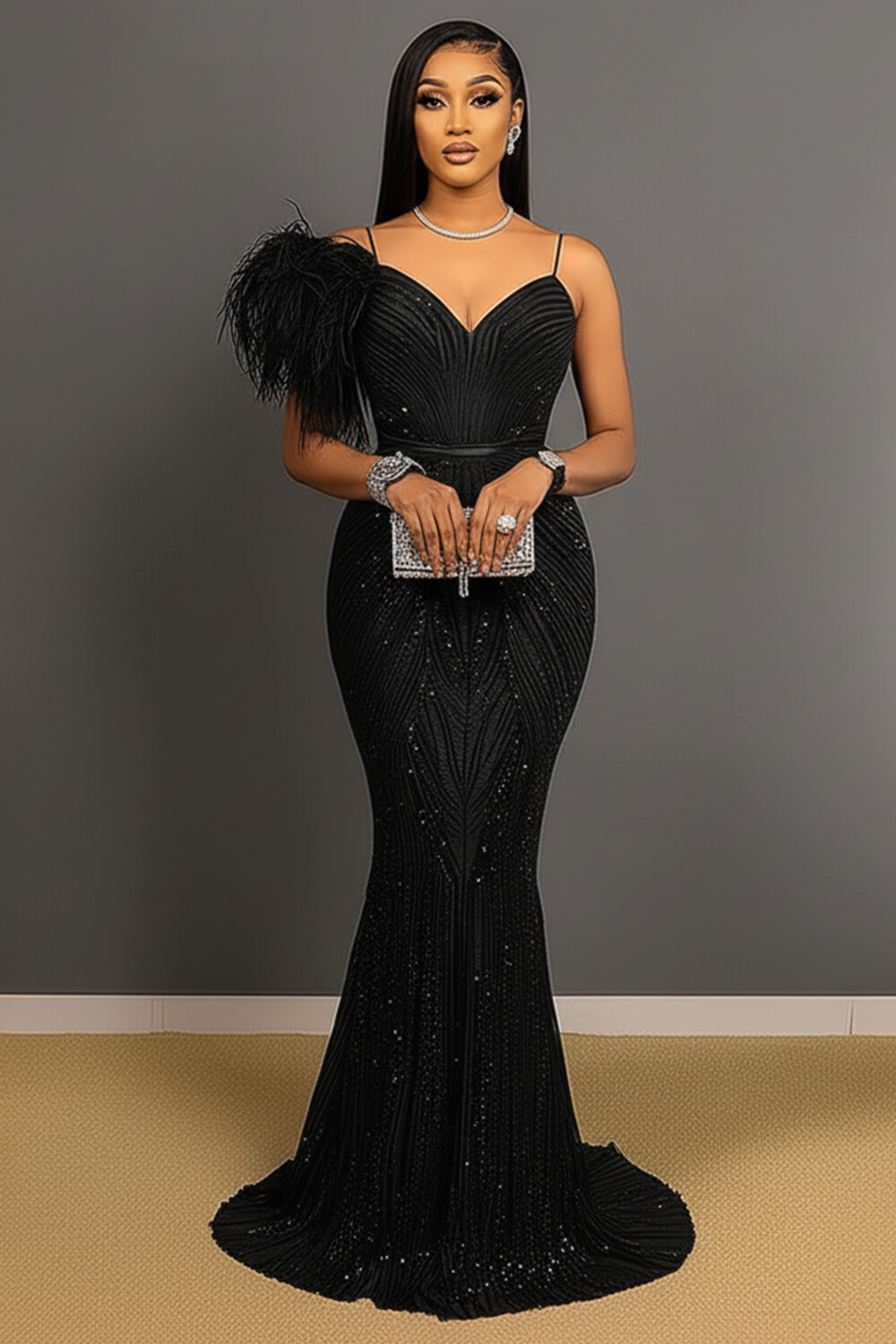Feather Glitter Textured Party Cami Fishtail Maxi Dresses-Black