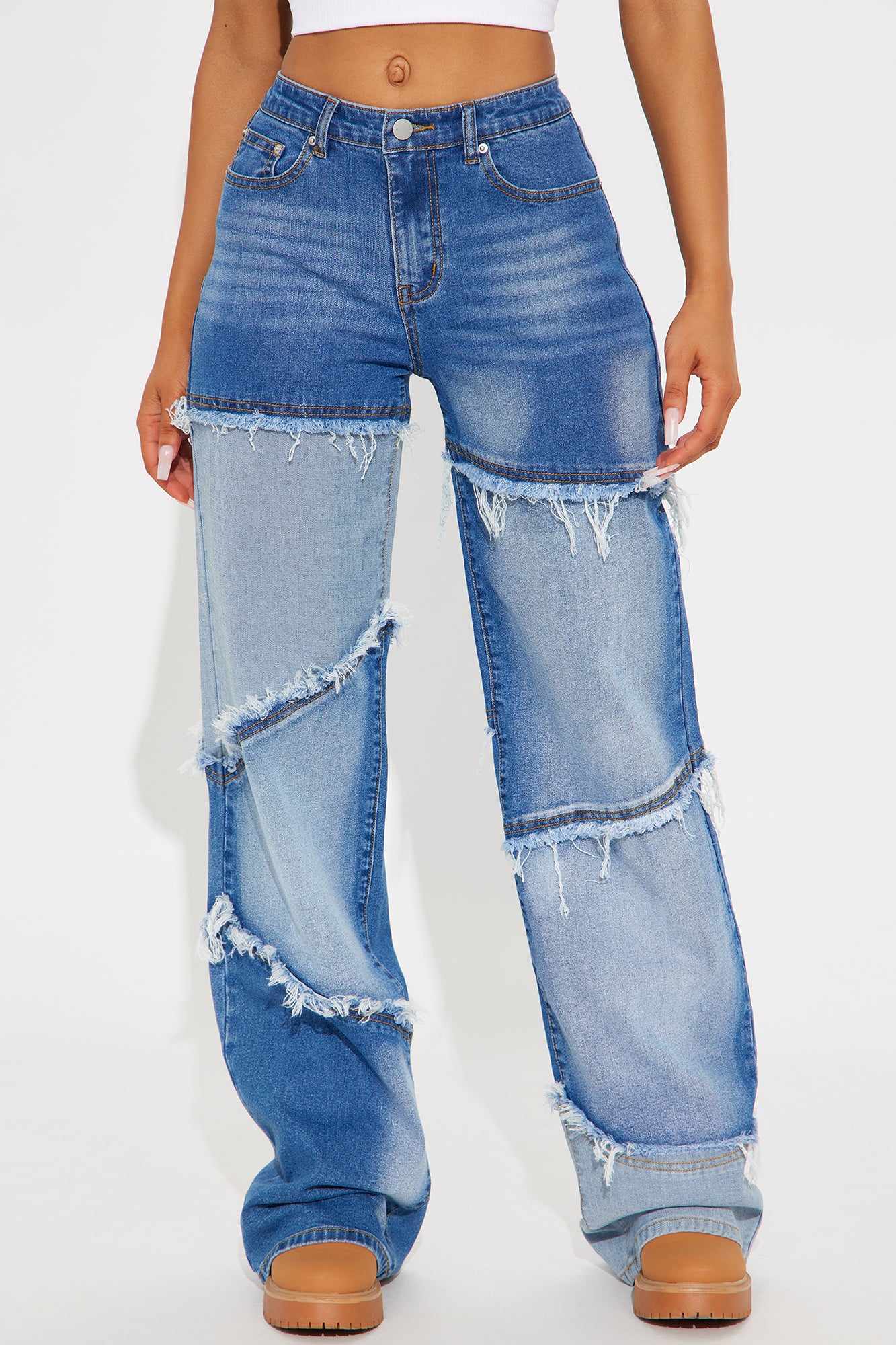 Available In Medium Wash. Wide Leg Jean 5 Pocket Two Tone Patchwork Fray Detail 10" Rise 34" Inseam Low Stretch Disclaimer: Due To The Specialized Wash, Each Garment Is Unique. 68% Cotton 27% Polyester 3% Viscose 2% Spandex Imported