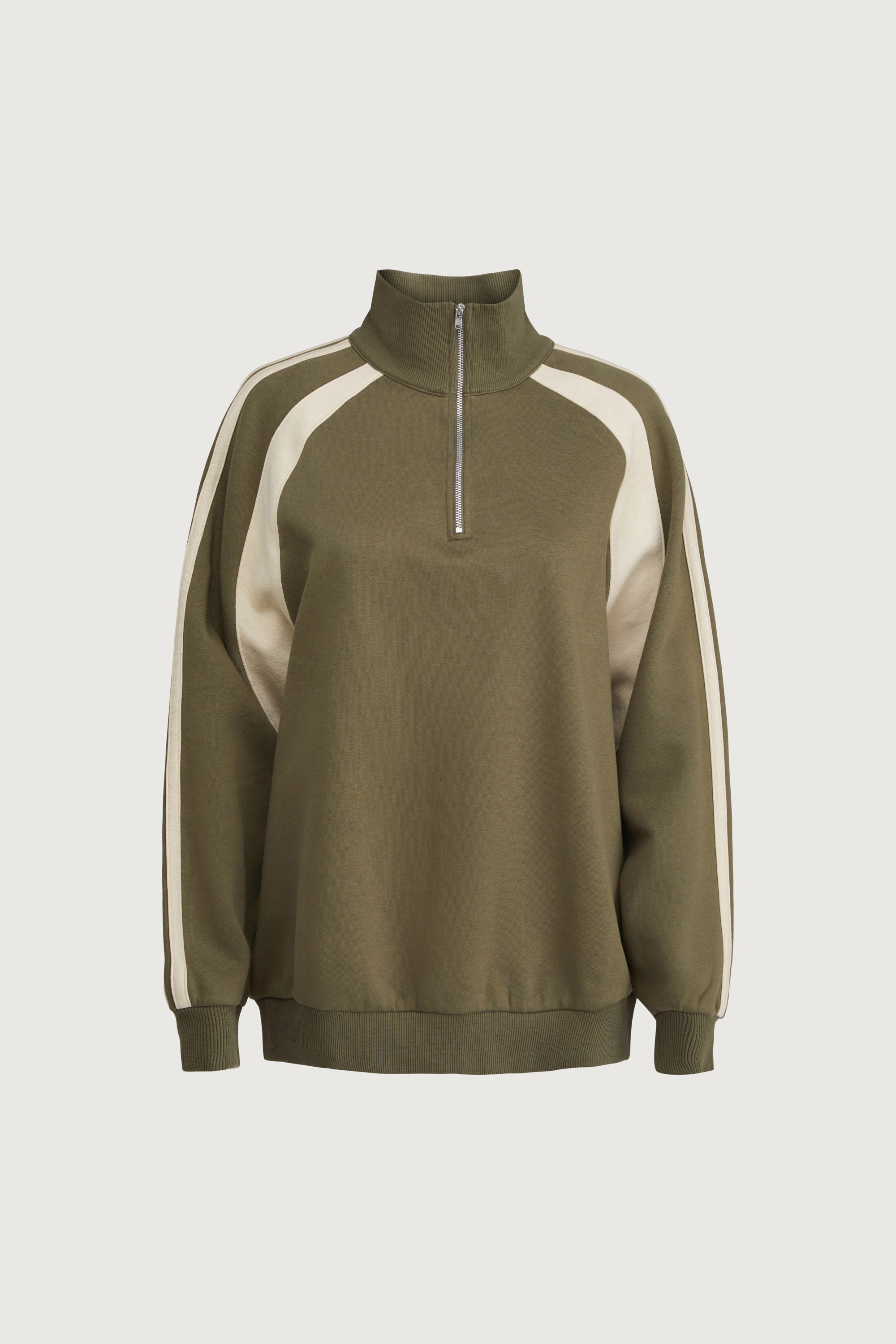This relaxed fit half zip pullover sweatshirt is varsity inspired and is made in a relaxed fit. It has contrast details at the shoulders and sleeves and ribbed trims. Pair yours with any bottoms from pleated skirts to joggers.