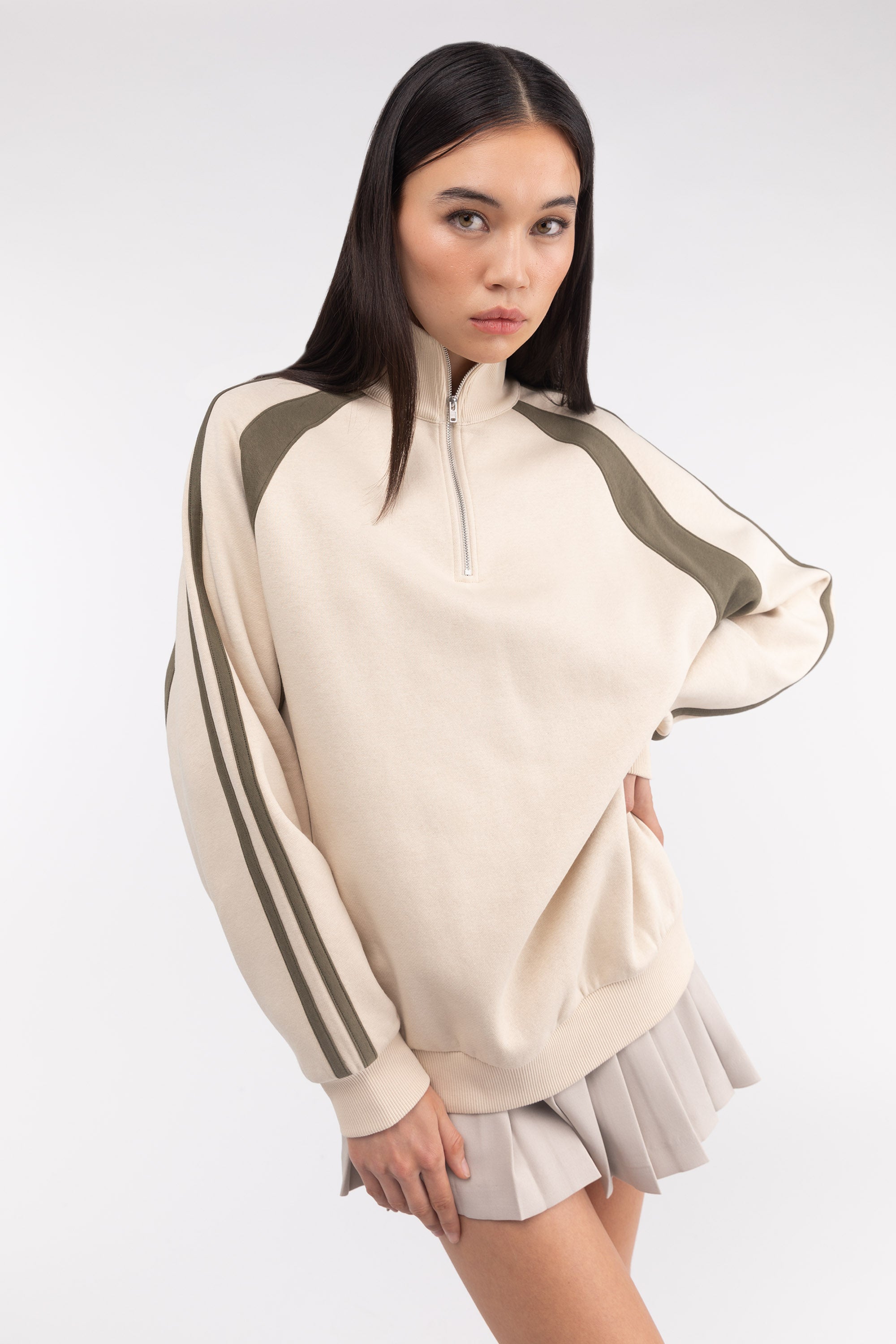 This relaxed fit half zip pullover sweatshirt is varsity inspired and is made in a relaxed fit. It has contrast details at the shoulders and sleeves and ribbed trims. Pair yours with any bottoms from pleated skirts to joggers.