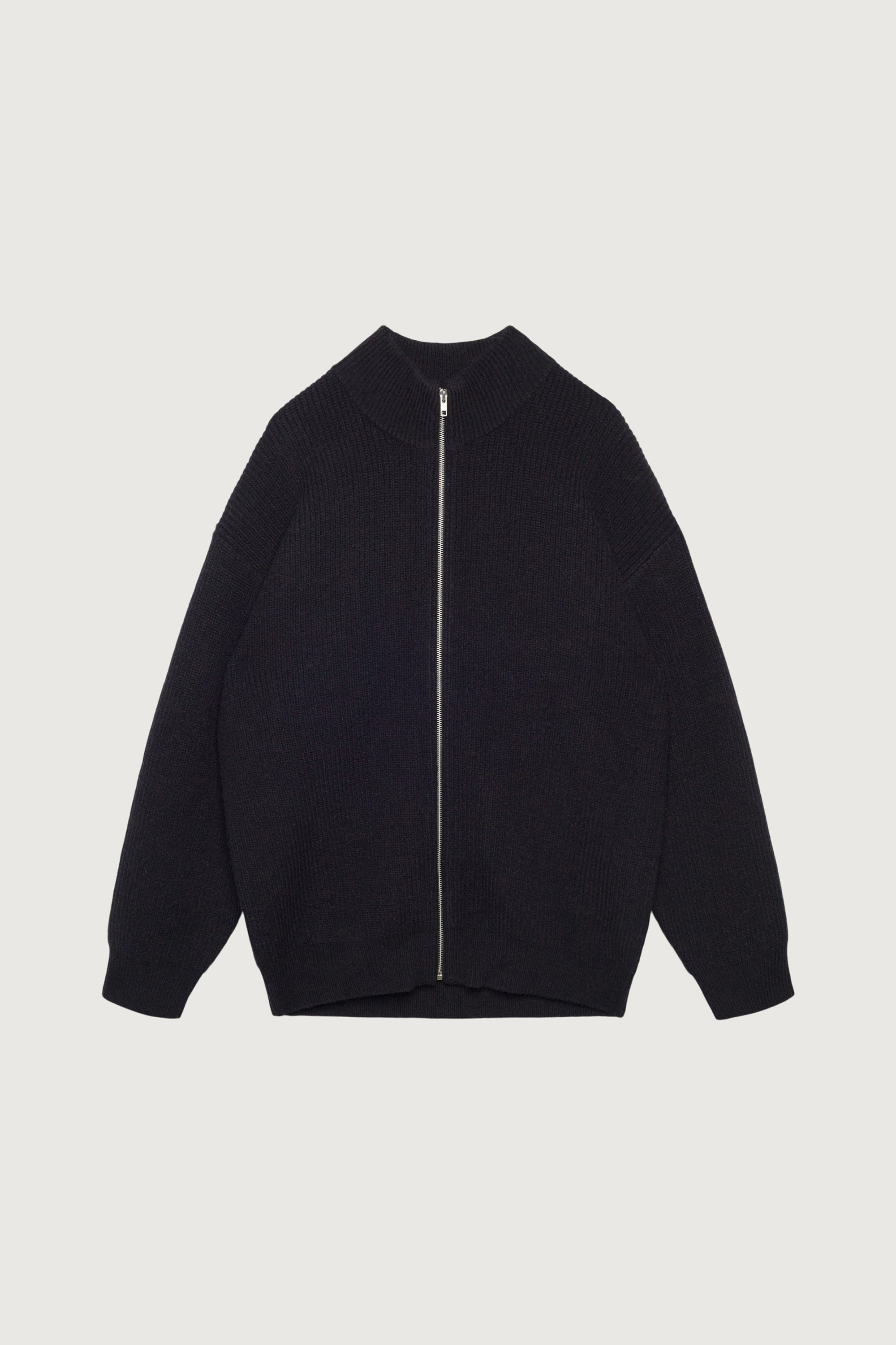 Oversized fit. Ribbed high neckline and trims. Zip-up front design. Dropped shoulders. 30.25" length based on size M.