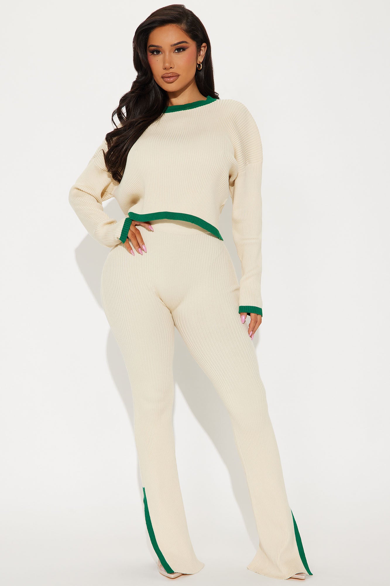 Available In Cream. Sweater Pant Set Pullover Sweater Contrast Crewneck Contrast Hem Straight Leg Pant Elastic Waistband Ankle Slits Stretch 33" Inseam 70% Viscose 30% Spandex Imported