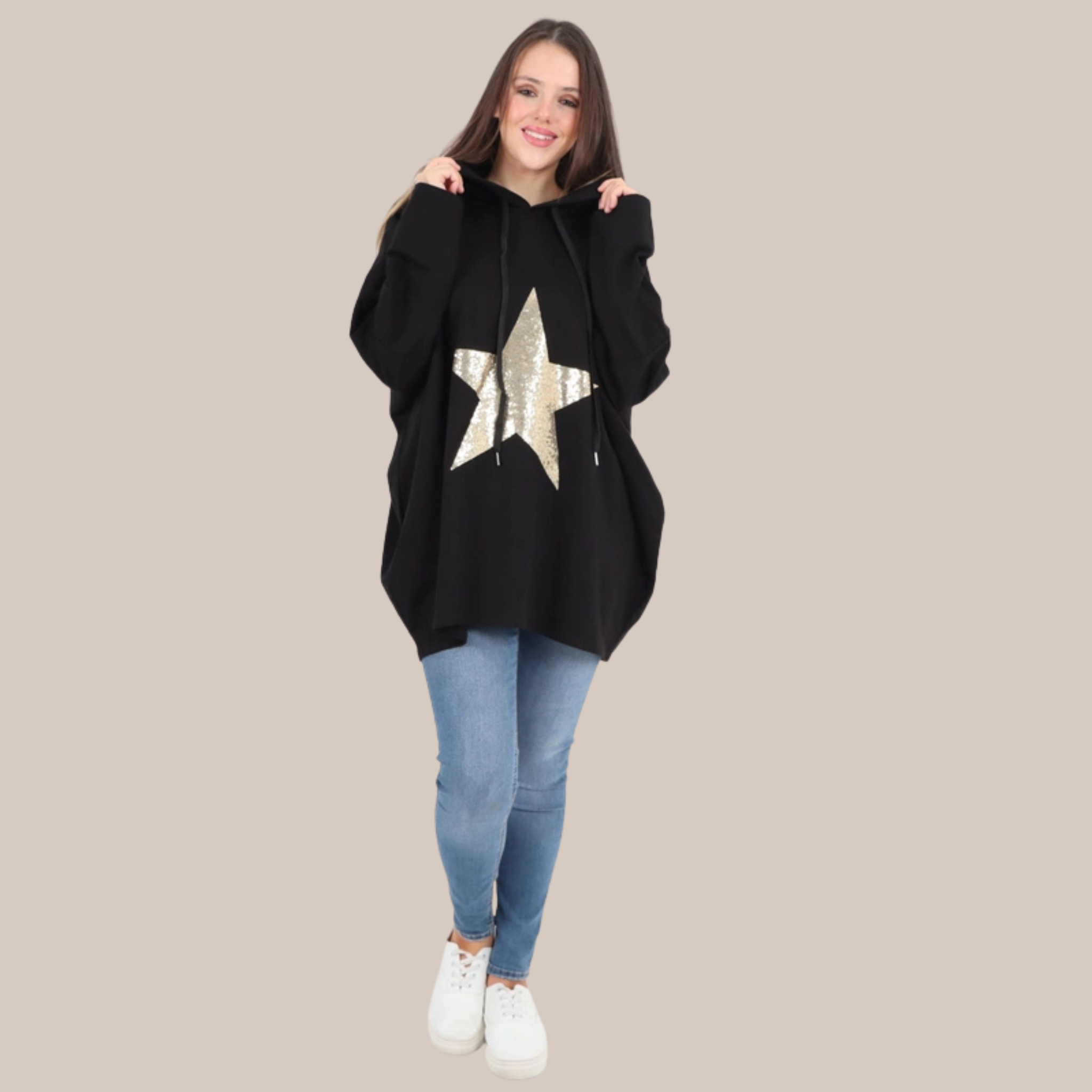 This oversized hooded sweatshirt features a bold star design on the front, blending casual comfort with contemporary style. Crafted for a relaxed fit, it offers warmth and ease of movement, making it an ideal choice for layering in cooler weather. The long length adds extra coverage, while the hood provides practical protection against the elements. Perfect for those seeking a statement piece that combines functionality with a modern edge.