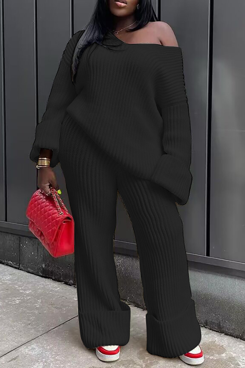 Pleated Knit Off Shoulder Long Sleeve Sweater Straight Leg Pants Matching Set-White