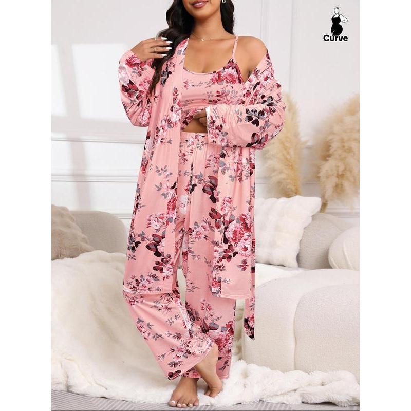 [Plus Size] Three-Piece Set Floral Print Belted Lounge Robe & Cami Top & Elastic Waist Pants Pyjama Set, Elegant Comfy Drop Shoulder Long Sleeve Robe & Sleeveless Top & Bow Decor Trousers PJ Set, Women's Sleepwear for Spring & Fall