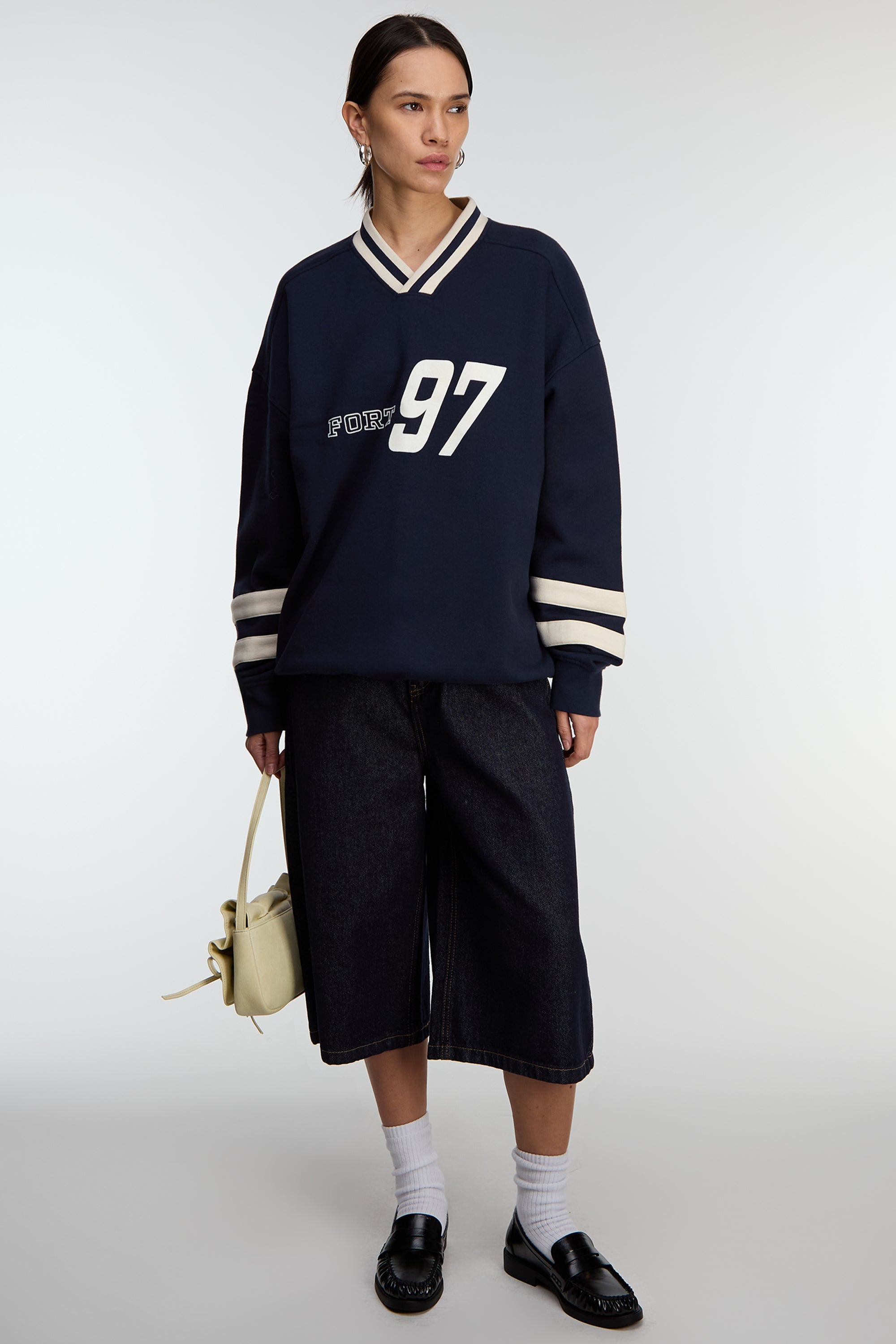 This varsity inspired V-neck sweatshirt is made in an oversized fit perfect for more casual days. It has stripe details along the sleeves, a contrast V-neckline and a graphic print on the front.
