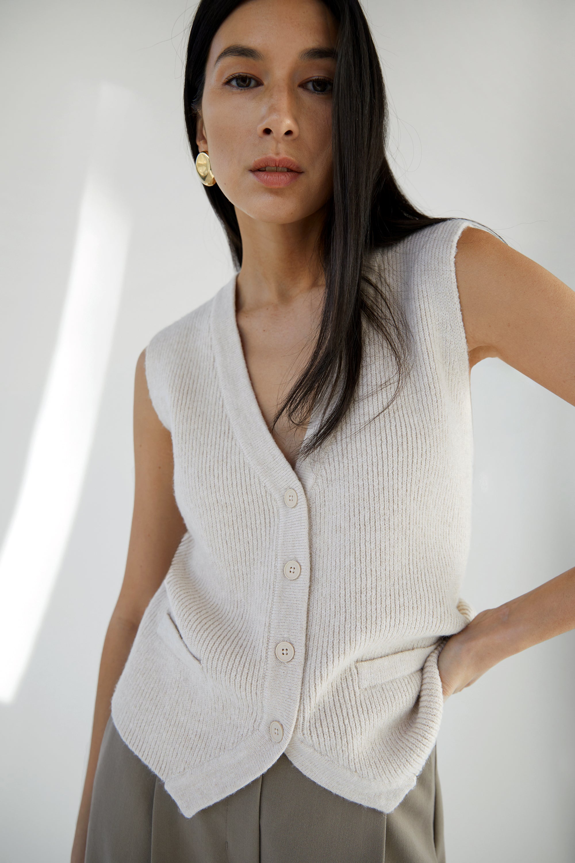 This knit vest cardigan is made in a relaxed fit with a button front and ribbed trims. A versatile piece to own, layer yours over a basic tee or wear it alone with a straight leg pants or a midi skirt.