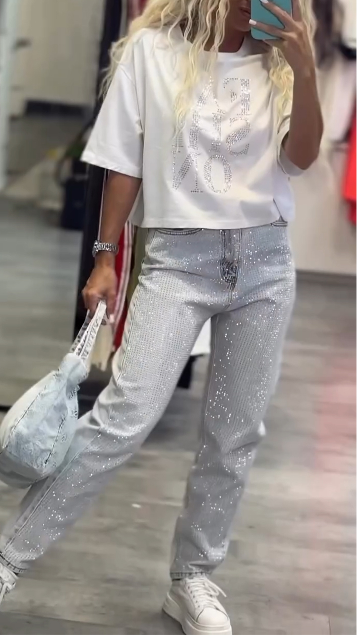 Women Round Neck Rhinestone T-shirt + Jeans Casual Suit