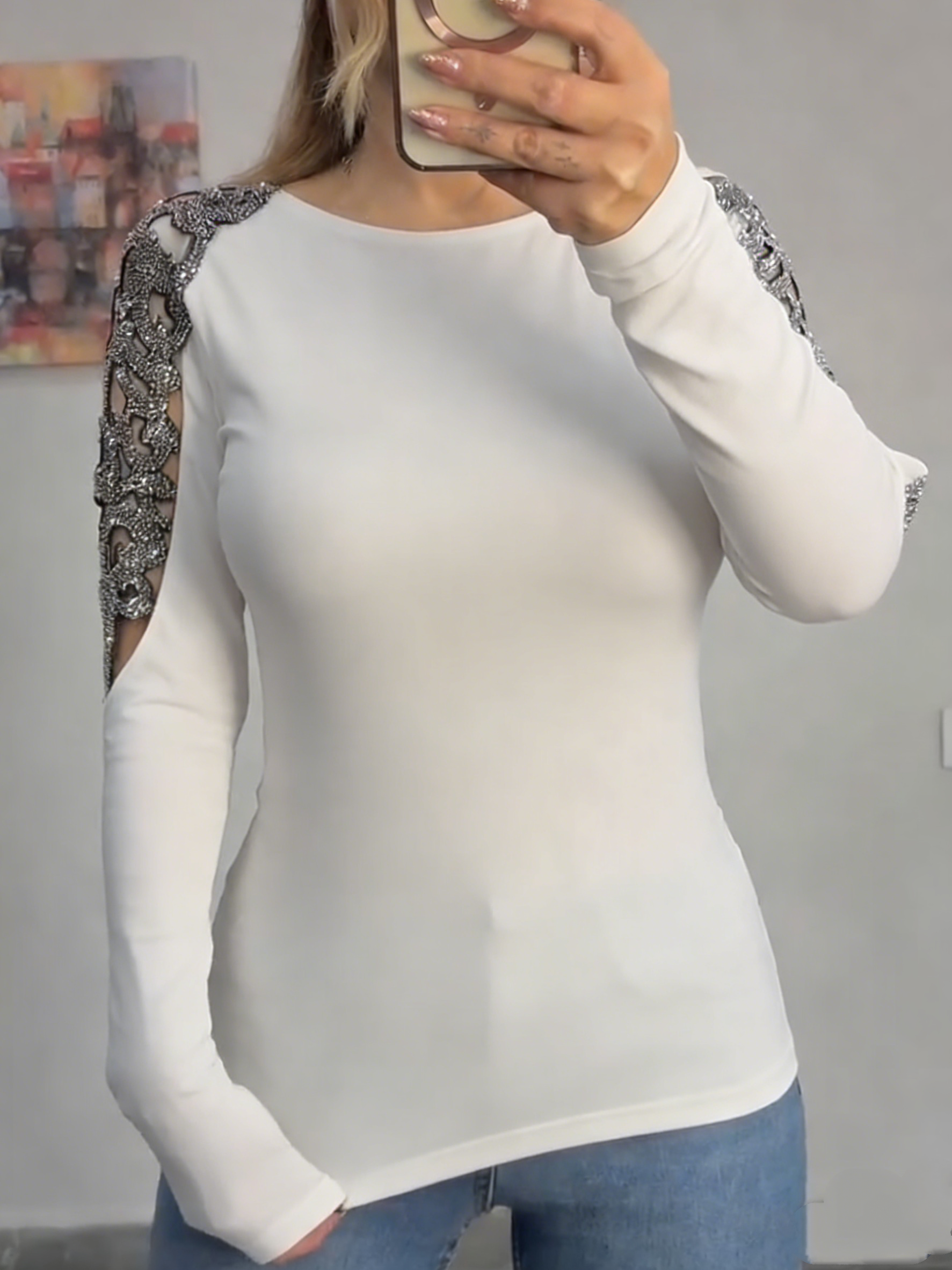 Women Round Neck Sleeves Hollowed Out Hot Stamping Rhinestone Casual Top