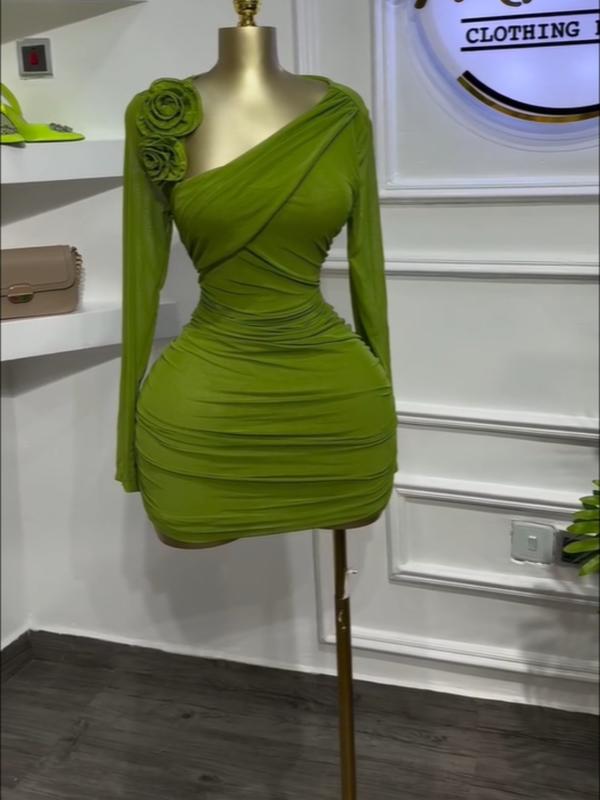 Women's Long Sleeve Floral Aqqlique Bodycon Midi Stacked Ruched Dress, Asymmetrical Neckline Party Birthday Dresses, Holiday Vacation Clothes for woman, Back To School, Education Cocktail Prom Dresses, Elastic Mini Dress, Green Dress, Red Dresses