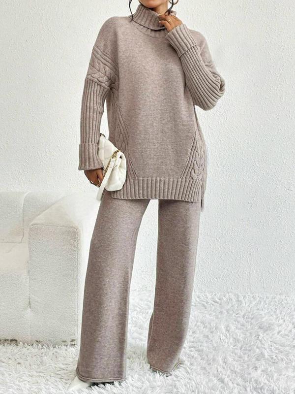 Women's Textured Split High Low Hem Sweater & Wide Leg Knitting Pants, Casual Fashion Cozy Turtle Neck Jumper & Trousers for Daily Outdoor Wear, Women's Knitwear for Fall & Winter